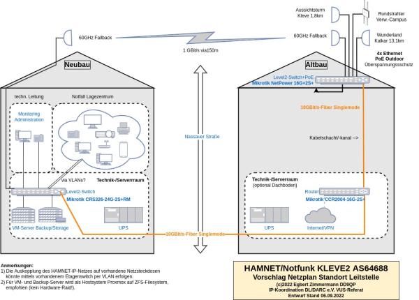Ähnliches ist auch für andere Dienste denkbar, die auch dann lokal verfügbar sein sollen, wenn alle Anbindungen an das externe HAMNET wegbrechen. Als denkbarer Standort ist die KFW-Leitstelle Kleve, je nach verfügbarem Platz, im Neu- oder Altbau naheliegend. Aber auch das Schulungs- und Ausbildungszentrum am KFW Gerätehaus Goch könnte ein geeigneter Standort sein. Es genügt dazu ein Mehr-Core Linux-Server mit dem kostenlosen Hypervisor Proxmox, auf dem mehrere virtuelle Maschinen betrieben werden können, die die gewünschten Dienste im HAMNET ausliefern. Im Idealfall sollte ein eigener Netzwerk- bzw. Serverschrank zur Unterbringung der Hf- und Netzwerktechnik und der Serversysteme zur Verfügung stehen.