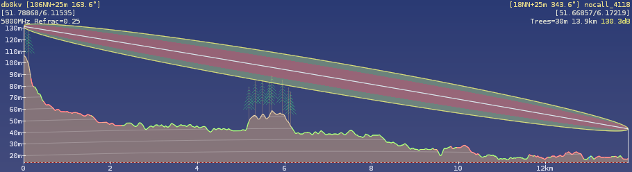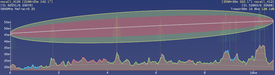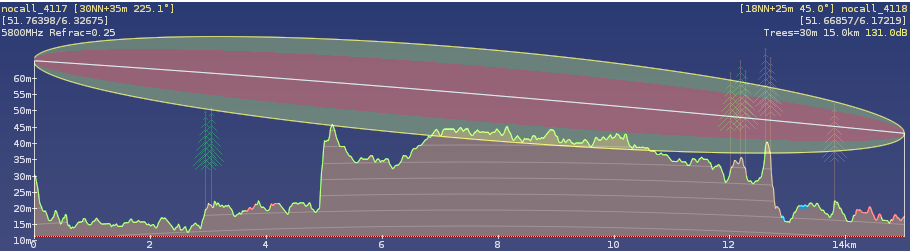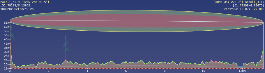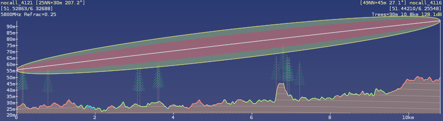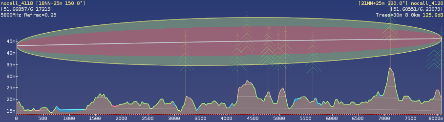 - Bei etlichen Linkstrecken ist wegen geringer bis mittlerer Abschattung der 1.Fresnelzone mit erhöhter Zusatzdämpfung zu rechnen. Diese ist stark abhängig von der jeweiligen Geländestruktur im Hindernisbereich und nur sehr schwer vorhersagbar. Möglicherweise sind auch bei relativ geringer Entfernung zum Ausgleich der erhöhten Streckendämpfung schon größere Antennen erforderlich als bei freier Line-of-Sight (LoS). Ohne vorherige Linktests lässt sich in solchen Fällen meist nicht vorhersagen, ob und wie der Link funktioniert.