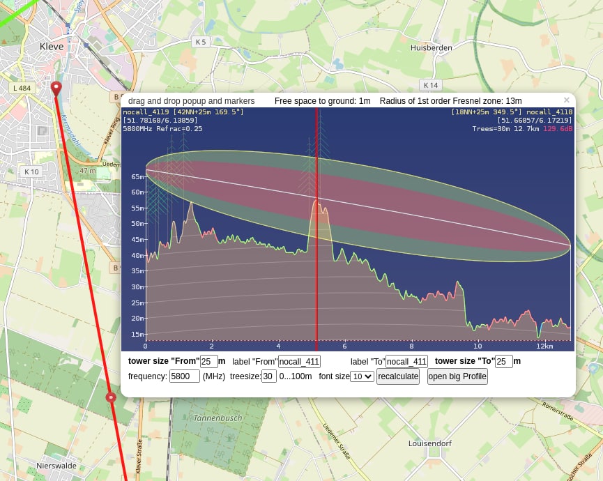 Wegen topografischer Beeinträchtigung der Sichtverbindung (Line of Sight LoS) scheint es leider nicht möglich, den Standort Kreisleitstelle (Neu- oder Altbau) mit dem Standort Kreisfeuerwehr Gerätehaus Goch (Schlauchturm) direkt miteinander per Richtfunk zu verbinden.